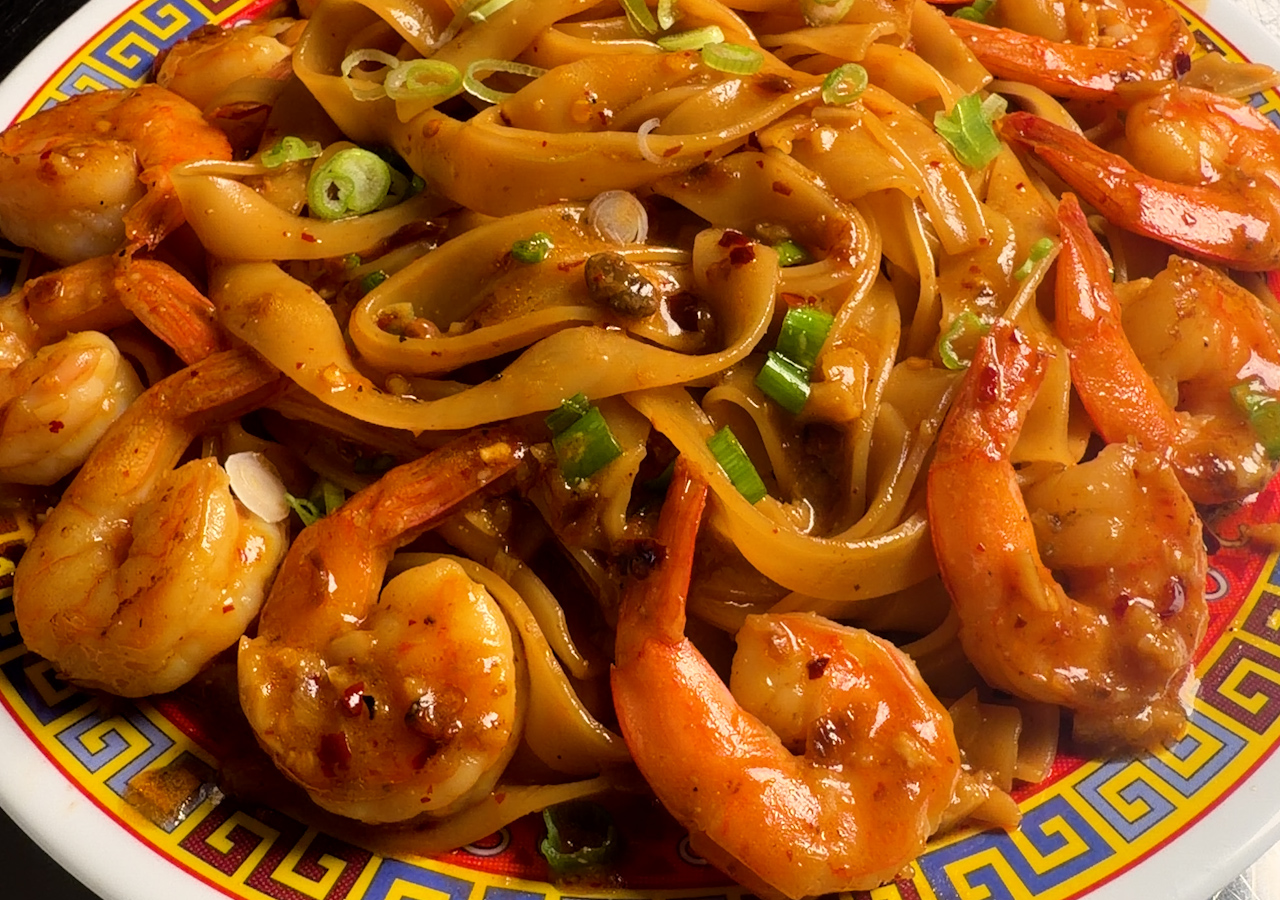 Jumbo shrimp seared hard, served over wide rice noodles coated…