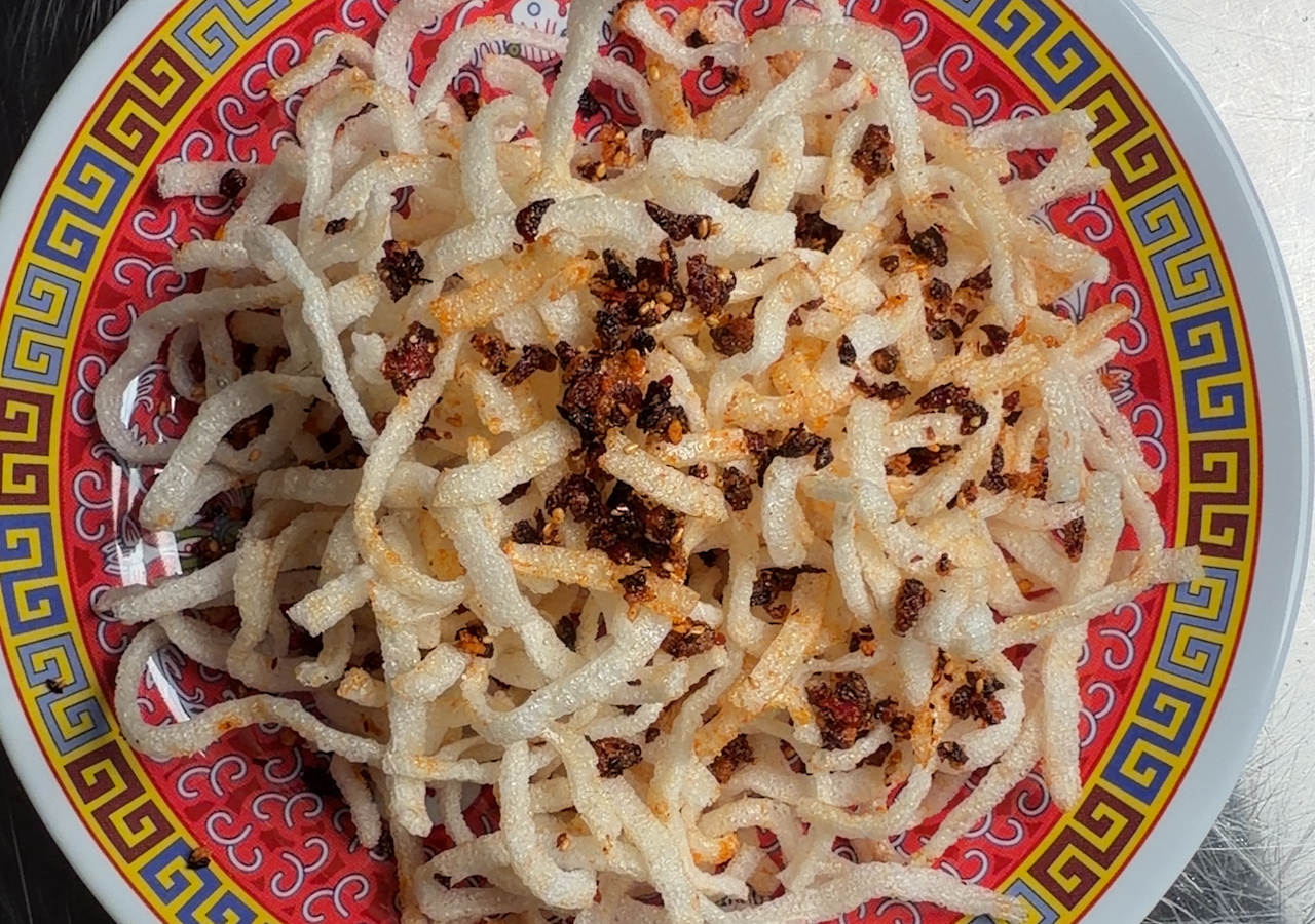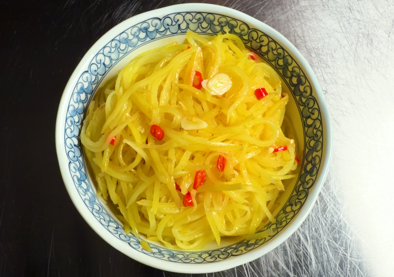 Stir-fried potato matchsticks tossed with garlic, chili, and a bright…