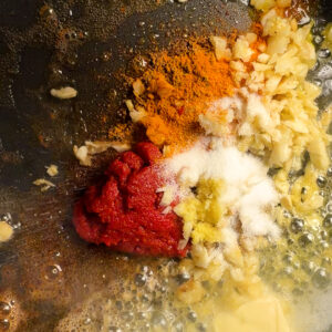 • Reduce heat to medium. Add butter, garlic, and ginger. Cook 30 seconds. Add tomato paste, garam masala, cumin, turmeric, cayenne, and sugar. Stir until paste darkens and spices bloom, about 1–2 minutes.