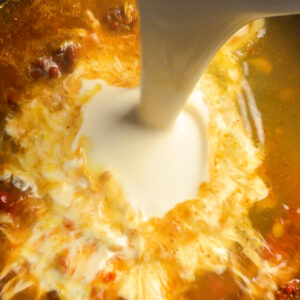 • Pour in cream and broth. Stir to combine. Add cooked chicken and linguine, submerge and stir. (Note: Be sure pasta is cooked in salted water. This will carry over to enhance the sauce)