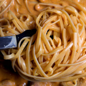 • Cook pasta (I recommend linguini for this dish) per package instructions until al dente then set aside.