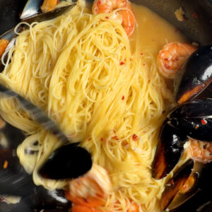- Add angel hair directly to the sauce and toss until fully coated. Add a splash of pasta water if it tightens too fast. Nestle shrimp and mussels back in and toss gently once to combine.