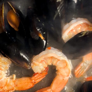- Mussels and shrimp go in together since they cook at roughly the same speed. Don’t overcook and pull them the moment the mussels open.