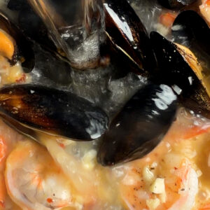 Mussels and shrimp cooked in browned butter, tossed with angel hair in a bright white wine lemon chili garlic sauce.