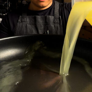 - In a hot pan, add soy sauce, lime juice, sugar, chili oil, coconut milk, and chicken stock. Bring to a boil.