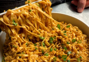 Fast, glossy noodles cooked directly in a chili–peanut sauce that emulsifies in the pan for a rich, clingy finish.