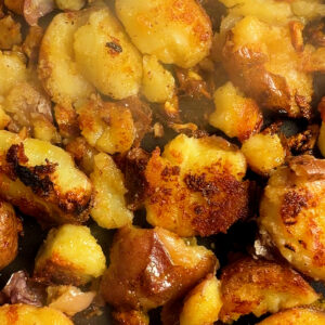 Baby potatoes boiled, smashed flat and roasted until craggy and crisp, finished with a bold chili garlic soy dressing and pools of chili oil.