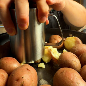 - Using the flat bottom of a cup or rigid container, press each potato firmly until it splays out flat. You want the skin to split and the edges to fan out into craggy, jagged pieces. The more irregular the better.