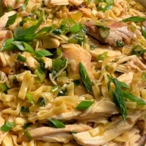 Slippery noodles tossed with rotisserie chicken in a fragrant ginger–scallion oil that coats everything in a savory, glossy finish.