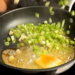 - Heat a skillet over medium-high heat and add the butter, sesame oil, and green onion whites.