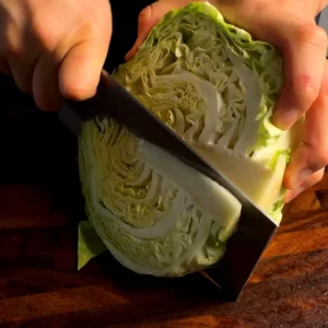 - Cut the cabbage in half through the core, then slice each half into wedges from the center outward, keeping the core intact so the wedges hold together.