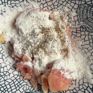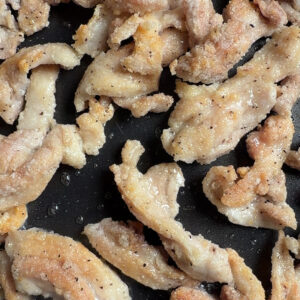 - Pat chicken thighs dry. Season generously with salt and pepper. Coat all sides evenly in cornstarch. It should look dry and chalky with no wet spots.