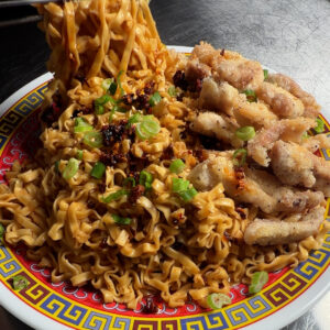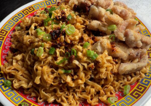 - Slice chicken thighs at an angle to show the golden crust cross-section. Plate noodles and lay chicken on top. Finish with scallions, sesame seeds, and extra chili crisp.