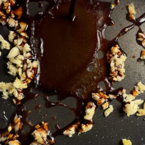 - Leave 1 tbsp oil in the pan. Add garlic and cook 20-30 seconds until fragrant, scraping up the fond. Add soy sauce, oyster sauce, sesame oil, chili crisp, and sugar. Stir to combine.