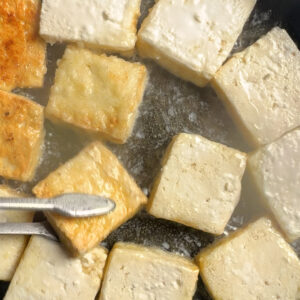 - Heat 1 inch of oil in a wok or deep skillet. Fry tofu in batches 3-4 minutes until a pale golden crust forms. Remove and drain. This cooks the inside through.