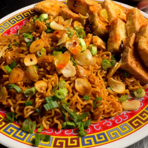 Double-fried tofu cubes with a shattering golden crust, tossed with ramen noodles in a bold soy-sriracha garlic sauce.