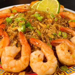 Jumbo shrimp lacquered in a sticky honey garlic soy glaze, served over silky glass noodles that soak up every drop of sauce.
