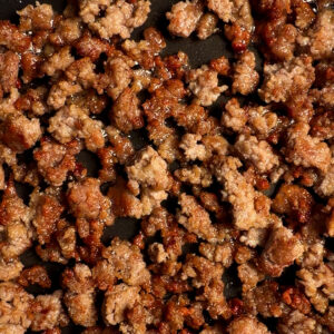 - Heat oil in a skillet over medium-high. Add pork and spread flat and let it sit 2 minutes until the bottom darkens and caramelizes. Break apart and cook until crispy-edged throughout, 2–3 more minutes. Add garlic and soy sauce, toss, and remove from heat. Set pork aside.