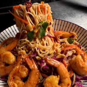 Cool vermicelli tossed in a bold peanut-lime dressing, layered with crisp red cabbage and carrots, and topped with smoky grilled shrimp.