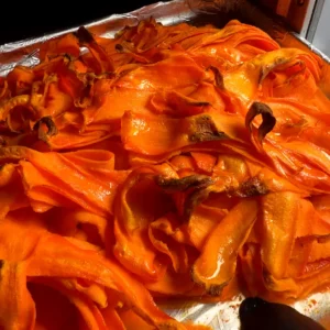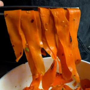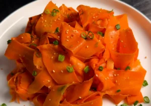 Carrot ribbons roasted until caramelized, then tossed in a soy-maple glaze and finished with chili and sesame.