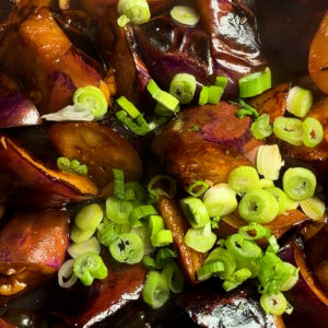 - Chinese or Japanese eggplant is essential. Globe eggplant can work, but it may turn too bitter so cook for a bit longer, low and slow.