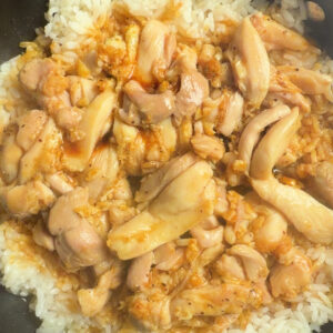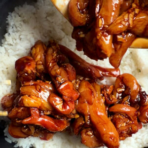 Sweet soy ginger chicken over crispy rice with a shattered golden crust.