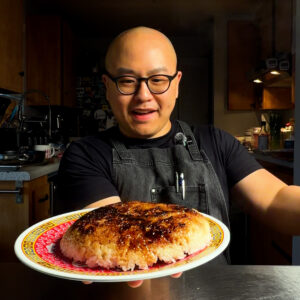 • Bring the pan to the table. Crack through the rice crust with a spoon — the shatter is the moment. Scrape up sections of crunchy rice with the saucy chicken on top.