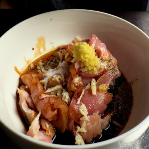 • Combine chicken with sweet soy sauce, soy sauce, sesame oil, garlic, ginger, sugar, and pepper. Toss to coat. Set aside while you prep.