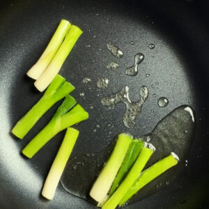 • Heat a small nonstick or cast iron skillet (8–9 inch) over medium. Add oil, then add scallion whites to the hot oil. Sear briefly, 30–45 seconds, until fragrant. Remove and set aside.