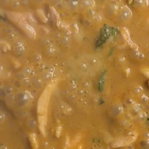 • Stir in peanut butter, soy sauce, sugar, and chicken stock. Whisk until smooth and gently simmering.